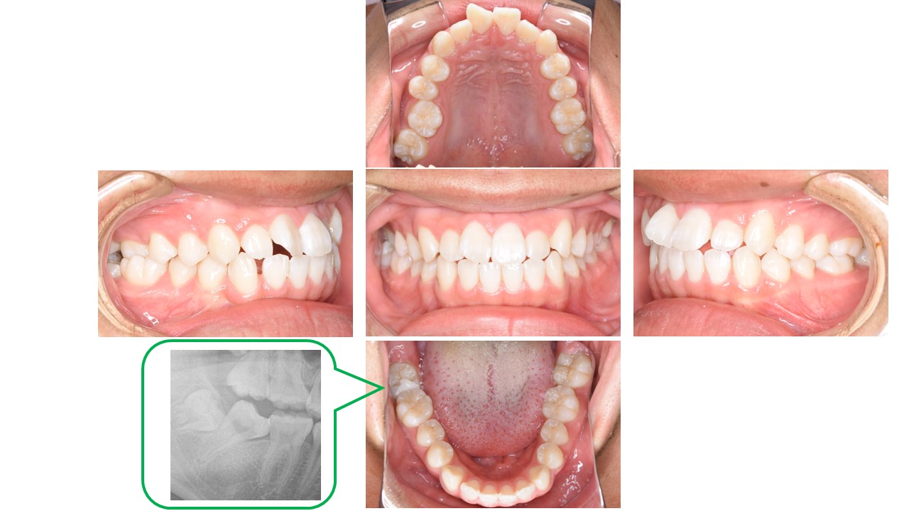 症状 上顎前歯翼状捻転・右側6鋏状咬合・下顎右側7近心傾斜により萌出困難 年齢・性別 初診時年齢 16歳2か月 男性 治療期間 1年11か月・通院回数計34回 治療方法 抜歯部位なし・マルチブラケット装置 費用 88万円(検査・診断・通院費込み)矯正歯科治療は公的健康保険の対象外の自費診療となります。 デメリット・注意点 歯の移動に伴う歯肉退縮や歯根吸収(この患者様では認められず)、清掃不良により一時的な歯肉腫脹 備考 診断名:下顎の左方偏位を伴う叢生 -